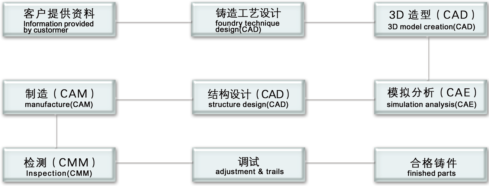 高素質(zhì)科技隊(duì)伍,一流的熱成型、高壓、重力、低壓及黑色鑄造工藝設(shè)計(jì)、 模具結(jié)構(gòu)設(shè)計(jì)人員,利用UG CATIA CREO AUTOCAD MAGMA FLOW-3D CIMATON LK/DIMS5.5 METRIS SCCAN4.2等設(shè)計(jì)、模擬、加工、檢測(cè)軟件,為制造一流的鑄造模具提供技術(shù)保障。